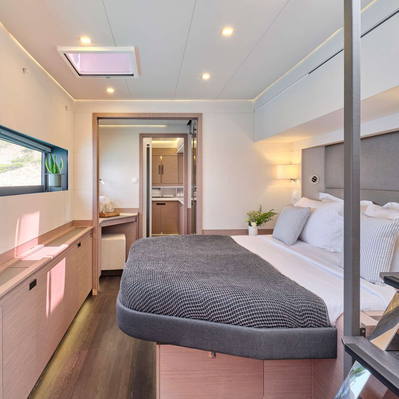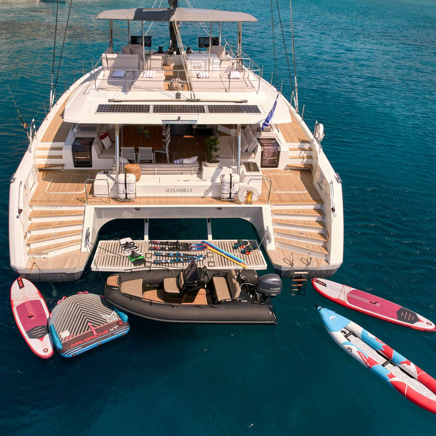 ALEXANDRA II is a 67-foot luxury Fountaine Pajot Alegria 67 sailing catamaran built in 2022, offering 4 deluxe cabins and accommodation for up to 8 guests. With premium onboard features like air conditioning, generator, watermaker, and a fully equipped galley, she delivers refined comfort and exceptional sailing capability. Spacious outdoor lounges including a flybridge with sunbeds, a foredeck Jacuzzi, and diverse water toys (SUPs, kayak, wakeboard, snorkel gear) create an unforgettable charter experience for family cruises or group holidays.