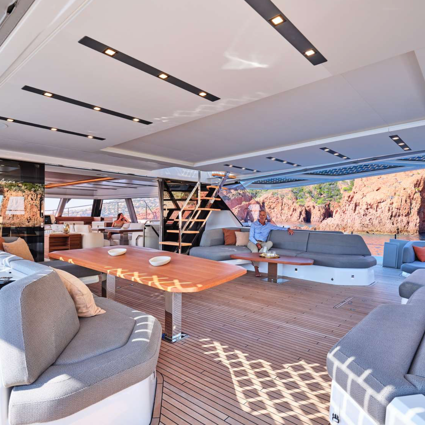 - Expansive Flybridge — Panoramic views, outdoor dining, wet bar
