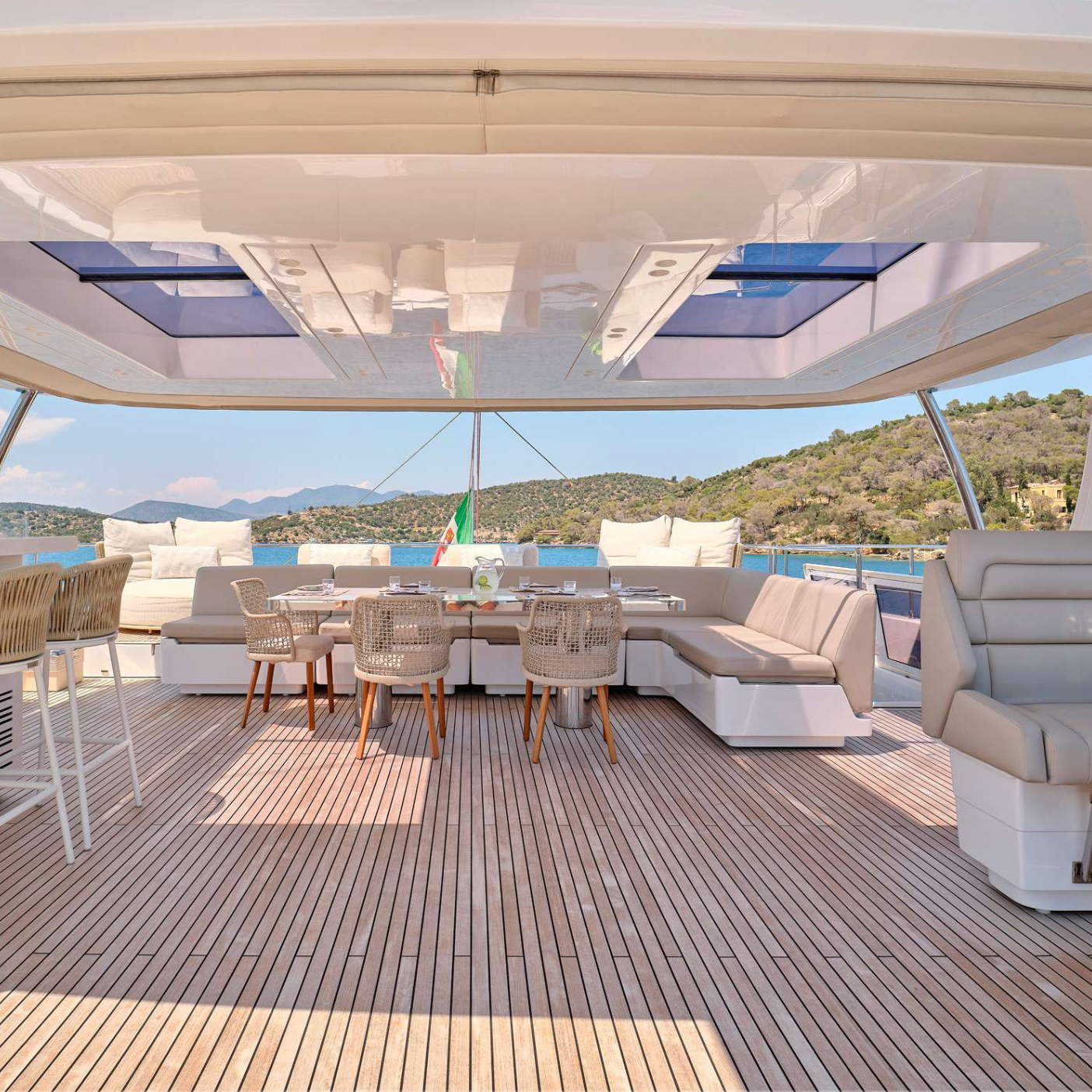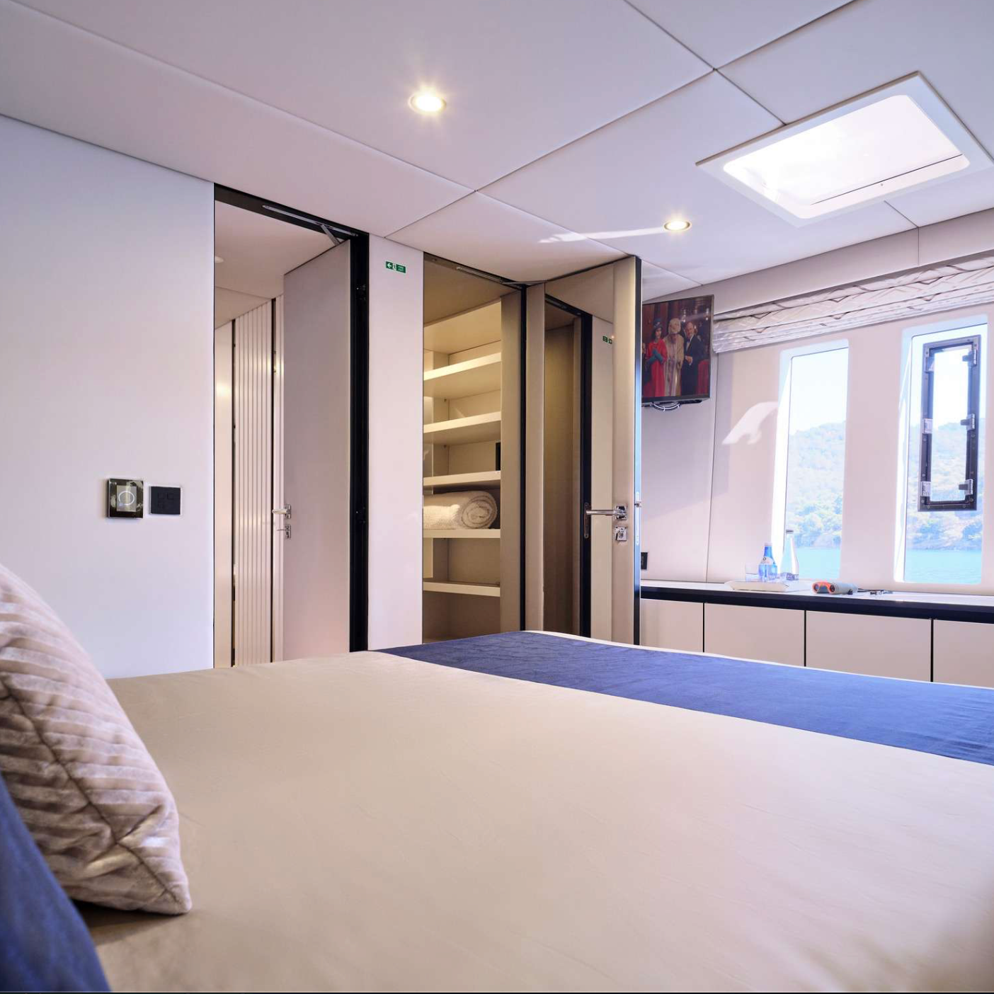 The GENNY is a 24 m (80 ft) luxury Sunreef 80 sailing catamaran built in 2021, featuring 5 ensuite cabins and accommodation for up to 10 guests. With premium onboard systems including air conditioning, generator, watermaker, and a fully equipped galley, GENNY delivers refined comfort and sophistication for Mediterranean cruising. Expansive indoor and outdoor living areas — from the panoramic salon to the flybridge and aft cockpit — plus a diverse suite of water toys (Axopar tender, SUPs, SeaBob, E-Foil, kayak, wakeboard, and more) make her ideal for family charters, group voyages, and unforgettable sea adventures.