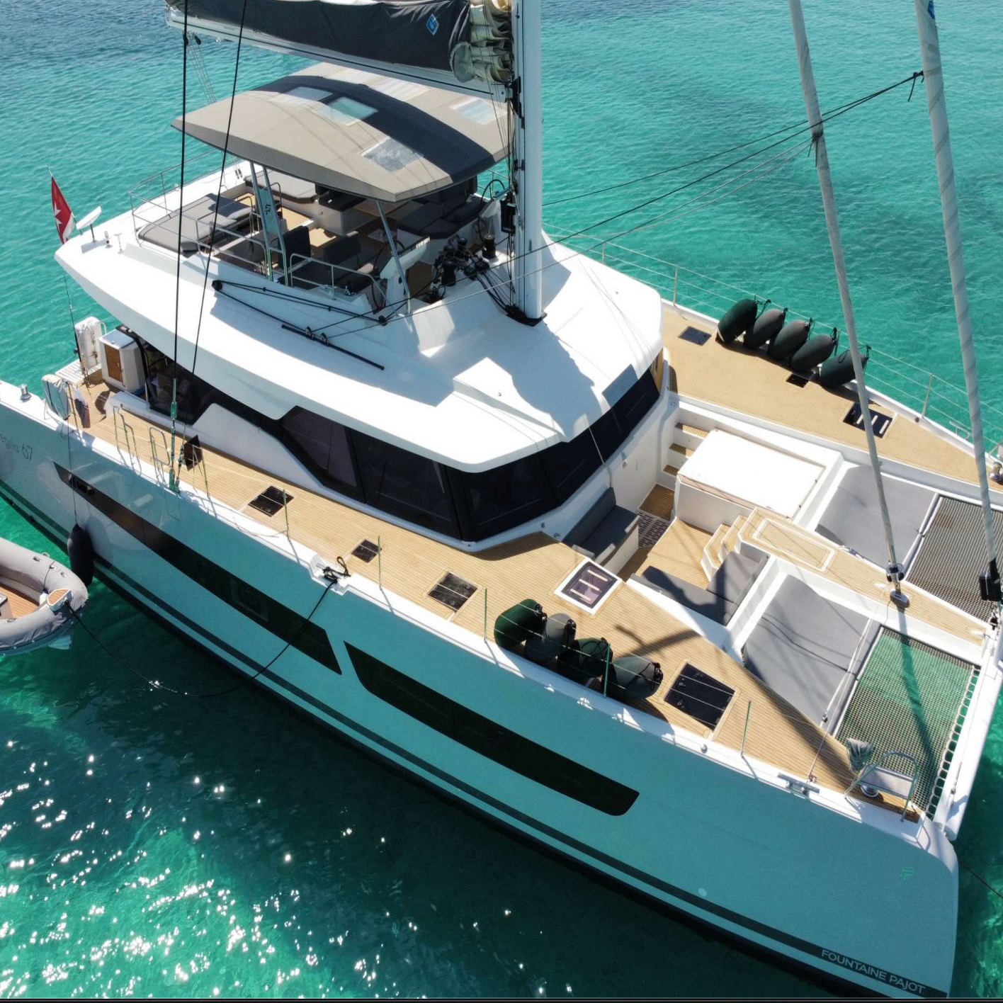 INSPIRANTE is a 67-foot luxury sailing catamaran built in 2021 by Fountaine Pajot, offering 4 ensuite cabins and accommodation for up to 8 guests. With premium onboard systems including air conditioning, generator, watermaker, and a fully equipped galley, she combines comfort and performance for memorable cruising. Expansive salon and outdoor living areas — including a forward Jacuzzi and flybridge — plus a suite of water toys such as paddleboards, seascooters, eFoil, wakeboard, and more, make INSPIRANTE ideal for family charters, group holidays, or bespoke sailing adventures.